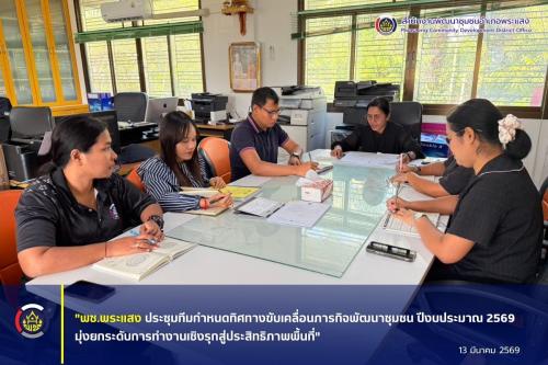 วันที่ 13 มีนาคม 2569 นางสาวจารุณี บัวแก้ว พัฒนาการอำเภอพระแสงพร้อมด้วยเจ้าหน้าที่พัฒนาชุมชนอำเภอพระแสง ร่วมประชุมเพื่อกำหนดแนวทางการดำเนินงานและวางแผนการขับเคลื่อนภารกิจงานพัฒนาชุมชน ประจำปีงบประมาณ พ.ศ. 2569 ณ สำนักงานพัฒนาชุมชนอำเภอพระแสง ที่ว่าการอำเภอพระแสง จังหวัดสุราษฎร์ธานี