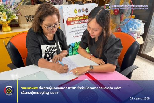 วันที่ 29 ตุลาคม 2568 นางสาวจารุณี บัวแก้ว พัฒนาการอำเภอพระแสง มอบหมายให้ นางสาวจุฑาทิพย์ ภาพสวัสดิ์ นักวิชาการพัฒนาชุมชนปฏิบัติการ ดำเนินการชี้แจงรายละเอียดและอำนวยความสะดวกแก่ผู้ผลิต ผู้ประกอบการ OTOP ในพื้นที่อำเภอพระแสง ที่มีความประสงค์เข้าร่วมโครงการ “คนละครึ่ง พลัส” ณ สำนักงานพัฒนาชุมชนอำเภอพระแสง จังหวัดสุราษฎร์ธานี ทั้งนี้ ได้ส่งเสริมให้ผู้ผลิต ผู้ประกอบการ OTOP ได้รับข้อมูลที่ถูกต้อง ครบถ้วน และสามารถเข้าร่วมโครงการได้อย่างสะดวก โดยเจ้าหน้าที่พัฒนาชุมชนได้ให้คำแนะนำขั้นตอนการลงทะเบียน ตรวจสอบความพร้อมของเอกสาร เพื่อให้กระบวนการสมัครเป็นไปอย่างราบรื่นและถูกต้องตามหลักเกณฑ์